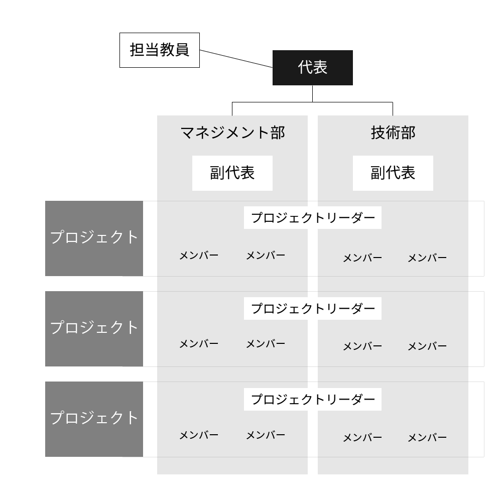 また、表しきれていませんが各プロジェクトはマネジメント部と技術部の下につくことになります。