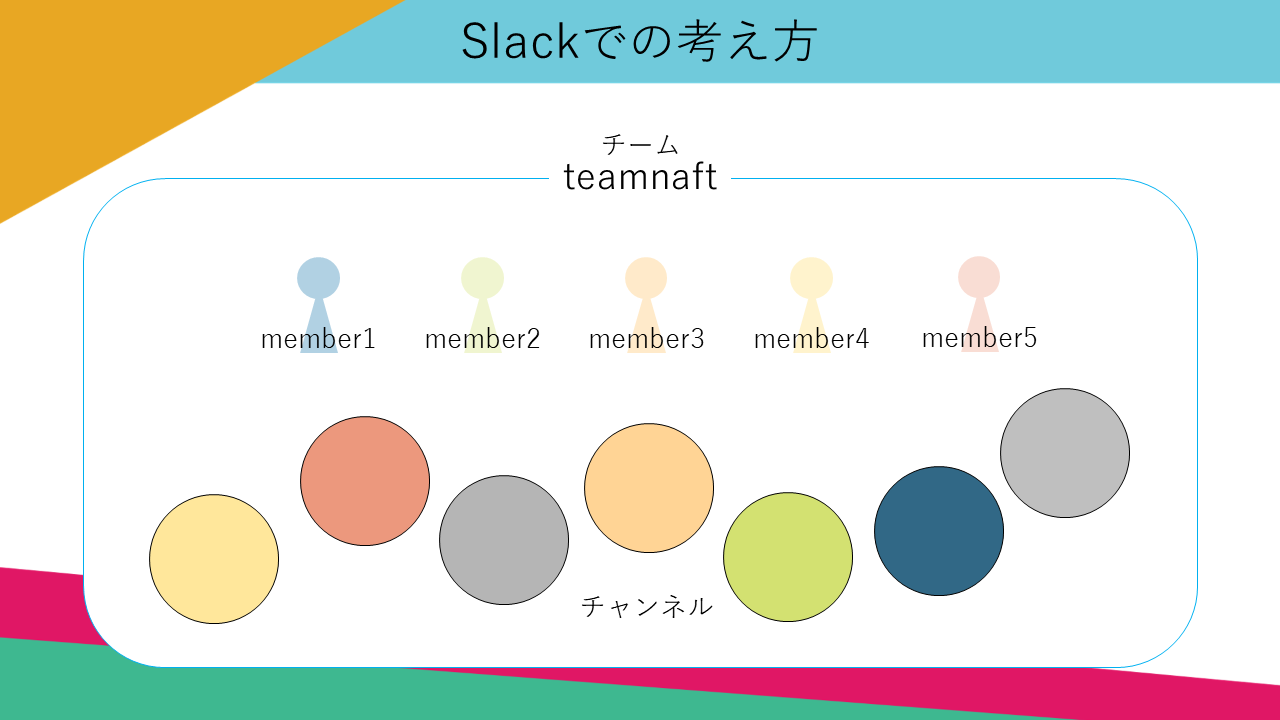 Slackではまずはじめに「チーム」が存在します。チームはいくつも作ることができ、それぞれにツールを連携したり、設定を適用したりできます。