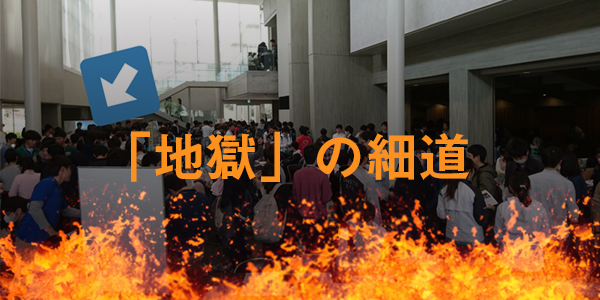 しかし、この細道、「地獄」の名がついているとおり簡単には抜け出すことができません。一般的な新入生で1時間~2時間、勧誘をしっかり受けると3時間近くかかってしまう人もいるというまさに「地獄」の「細道」なのです。